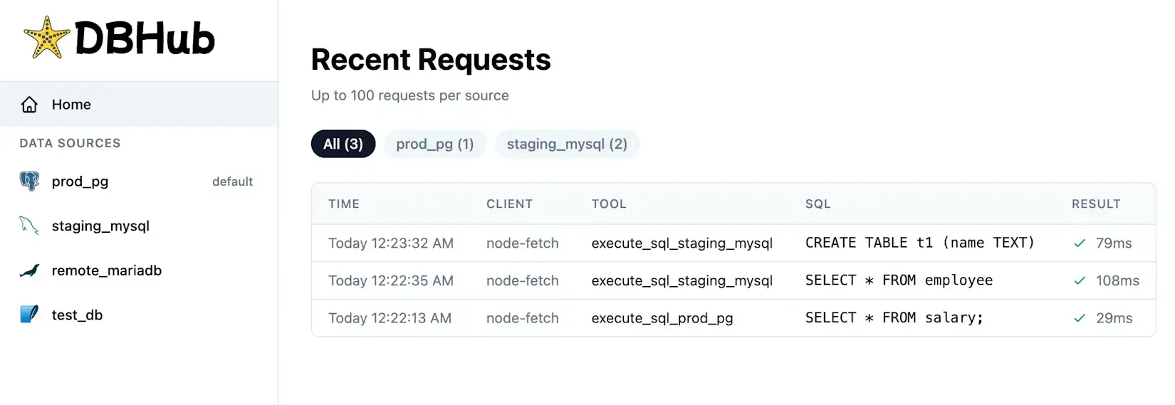 Compared with other database MCP servers, DBHub comes with an admin console to view configured data sources and trace SQL requests.
