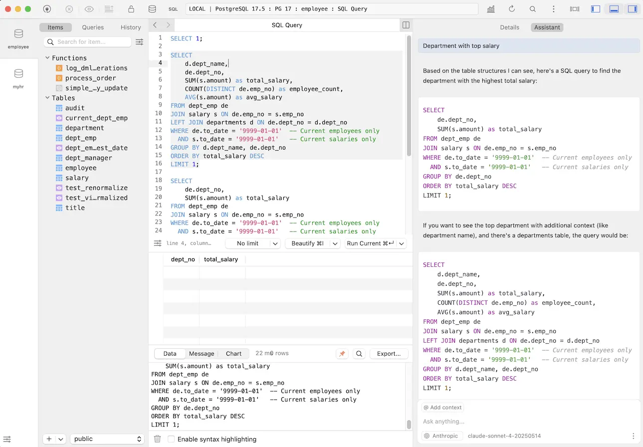 TablePlus is considered by many as the best SQL client on Mac. It's a modern, native database management tool that supports multiple databases. It has integrated text-to-SQL AI capabilities to help developers generate queries from natural language.